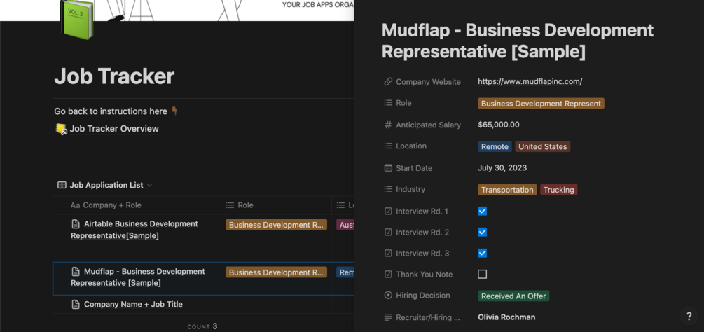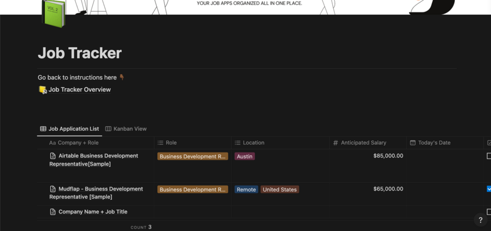 - The database is setup as a master view where you can see everything at a high-level (hiring decision, salary, location, etc). You can edit, customize, and adjust the job tracker however you see fit.
